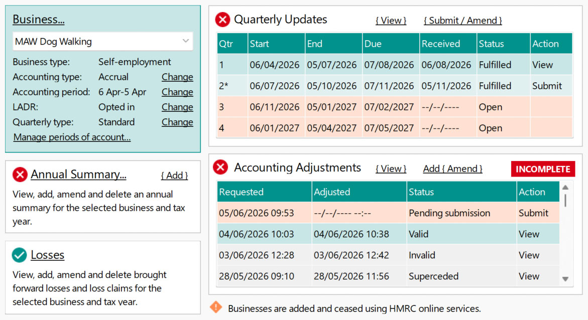 Submit quarterly updates, annual summaries, accounting adjustments and brought forward losses for all your business and/or property incomes.
